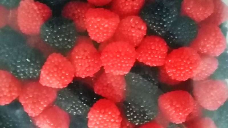 Gelee-Beeren, weicher Gelee-Kern, überzogen mit Zuckerperlen, in Him- und Brombeergeschmack.