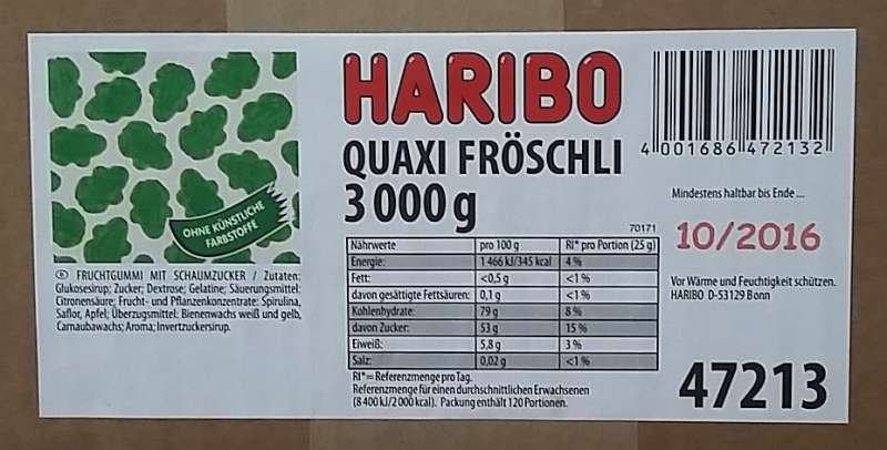 Fruchtgummi-Frösche im Gastropack mit Schaumzuckerboden und Pfirsich-Maracujageschmack.