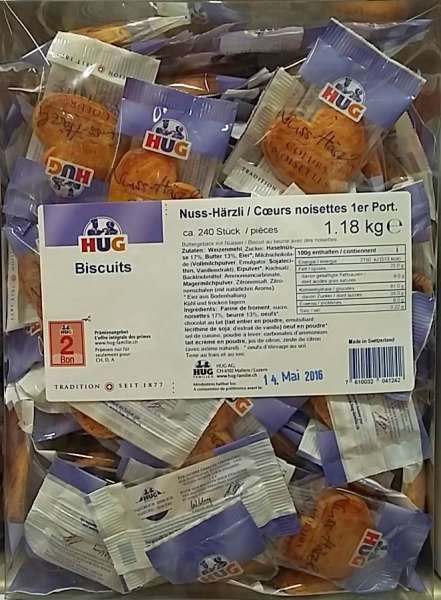 Einzeln abgepackte butterzarte Haselnuss Härzli. Ideal fürs Büro, Kaffeebeilage, Versand, Messen etc.