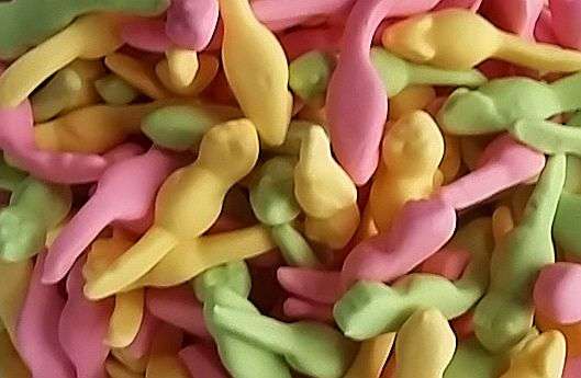 Gelee-Beeren, weicher Gelee-Kern, überzogen mit Zuckerperlen, in Him- und Brombeergeschmack.