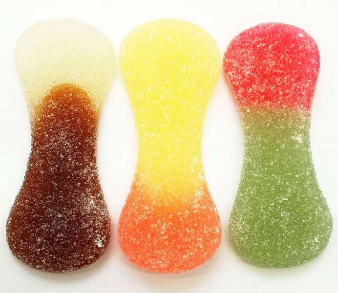 saure Fruchtgummi-Gurte, mit Zucker kandiert, in Cola-Geschmack. Ohne Gelatine.
